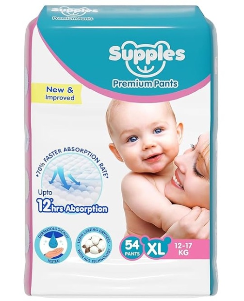 Amazon Brand – Supples Premium Baby Diaper Pants | 54 Baby Diapers | XL | 12-17 Kg | 12 Hrs Absorption | Cushiony Cotton Soft Fabric | Phthalates-Free | Triple Leak Guard