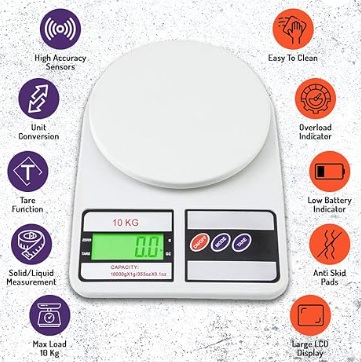ATOM ALISTON K1 Series Digital Kitchen Weighing Scale 10 kg, Electronic Weight Machine with LCD Display for Baking, Cooking, Food & Diet, SF-400/A121. 6Months Warranty (Colour May Vary)