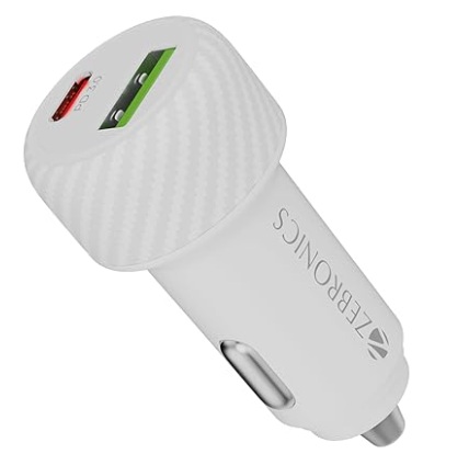 Zebronics 48W Car Charger with Dual Output – Type-C (30W) & USB (18W) PPS Tech Rapid Charging LED Indicator, for Smartphones, iPhones, Tablets, Earbuds (CC48 Plus, White)